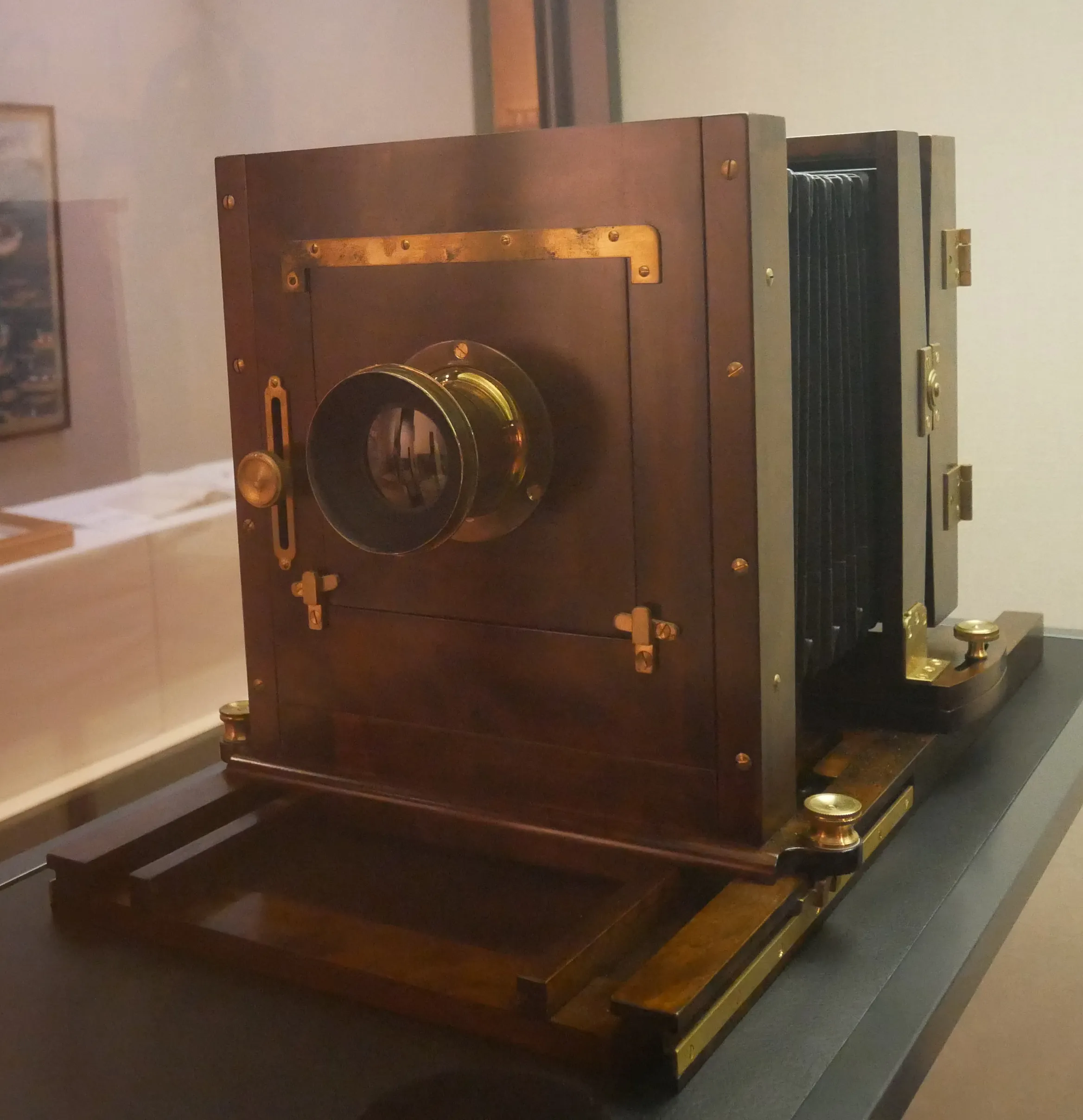 長崎の博物館展示では、上野撮影局で使用されていたカメラ(複製)が現存しており、その実物を確認することができます。カメラ本体は暗褐色の木製大型箱型で、真鍮(ブラス)の金具や調節ネジが随所に使われています。蛇腹(ベローズ)と前板・後板で構成された構造で、前板を前後に動かすことでピント調節が行われました。